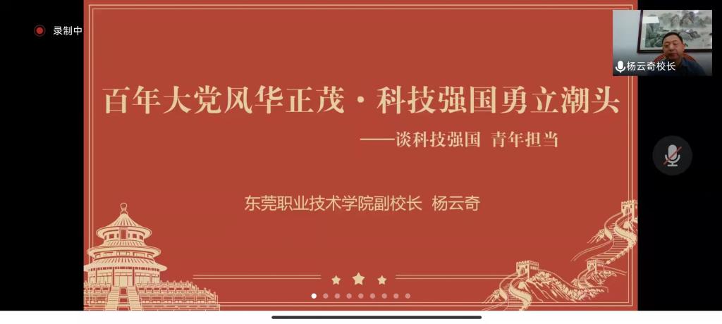 3月21日上午,党委委员、副校长杨云奇在线上向21级电子两年1、2班的同学讲授《百年大党风华正茂·科技强国勇立潮头—谈科技强国 青年担当》,杨云奇副校长以开天辟地闯新路、一张白纸绘新图、伟大变革奠新基以及走向复兴谱新章四个篇章为同学们生动的展示了我国从科技救国、科技建国、科技兴国到科技强国的发展历程。他指出,青年人要有担当,要做到胸有大志、肩有大任、眼有星辰、行有大德。要为实现建设世界科技强国的目标、为实现中华民族伟大复兴而不懈奋斗。