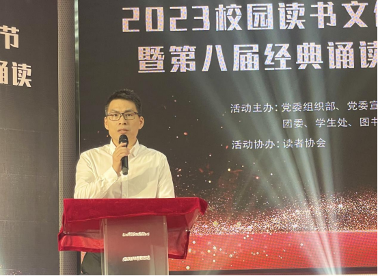 蔡东宝副书记表示,我校一直以来高度重视书香校园建设,积极响应党的二十大报告中“深化全民阅读活动”的号召,以文化强市为依托,组织类型多样、内容丰富的校园读书文化节活动。他希望大家勤读经典,多读书,读好书,养浩然之气,塑高尚人格,不断提高人文素养和精神境界,为建功新时代积蓄青春力量。