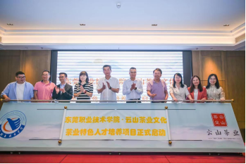 5月28日下午,“东莞职业技术学院—东莞市云山茶业文化有限公司茶业特色人才培养项目签约暨启动仪式”在东莞迎宾馆举行。我校副校长刘海光、产教融合办主任何风梅、国际交流学院党总支书记李玮炜、经济与管理学院党总支书记陈柏林、经济与管理学院院长周虹、东莞市茶叶行业协会会长卢树勋、中国国家地理—国茶地理高级顾问萧荣、德国TUV莱茵学院大中华区副总裁林小霞、东莞市云山茶业文化有限公司董事长钟跃东、总经理刘采芸等出席仪式。