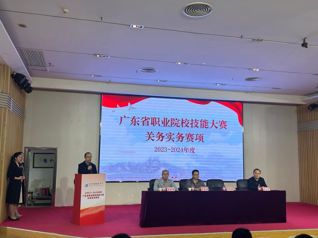 由广东省教育厅主办,我校承办的2023—2024年度广东省职业院校技能大赛关务实务赛项于2024年1月5-7日在我校举行。开幕式于2024年1月6日在我校图书馆学术报告厅正式拉开帷幕。我校党委副书记、校长贺定修,东莞市教育局教研室教研员赛项督察吴观福,商贸学院党总支书记、院长颜汉军,教务处副处长孟鑫沛出席开幕式。开幕式上,贺定修代表我校致辞,他祝愿各位参赛选手能在赛事中展现出最佳状态,共同推动关务实务与物流行业的进步。