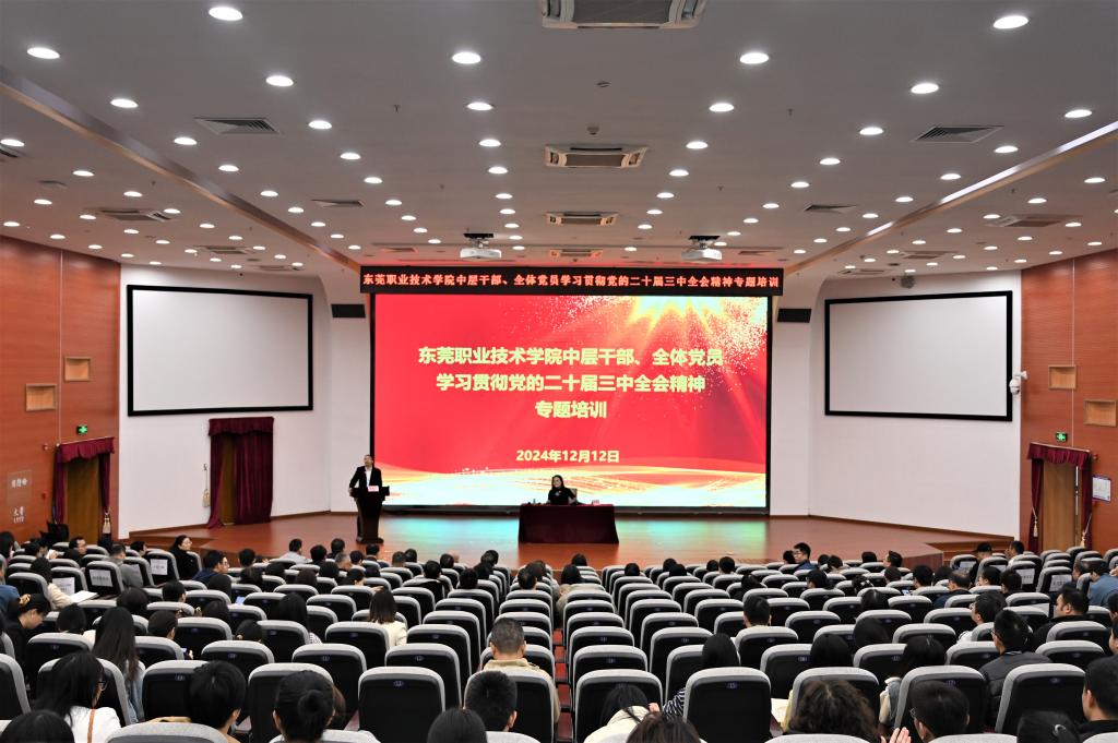 为深入贯彻落实上级党组织要求,根据《东莞职业技术学院学习宣传贯彻党的二十届三中全会精神学习培训工作方案》文件精神,由我校党委组织部(党校)组织的中层干部、全体党员学习贯彻党的二十届三中全会精神专题培训班于12月11日至13日举办,培训安排11日至12日为线下授课,13日为各党总支自由学习和研讨。培训班邀请了来自华南理工大学、华南师范大学和南方医科大学等单位的4名专家学者进行授课。我校中层干部、全体党员500余人参加了此次专题培训。