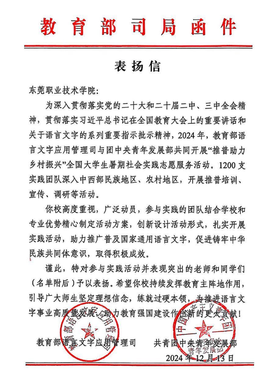 近日,教育部语言文字应用管理司联合共青团中央青年发展部向学院2024年“推普助力乡村振兴”全国大学生暑期社会实践“声动藏区·粤来阅好”团队发来表扬信。表扬信指出,我校学前教育与人文学院赴西藏林芝推普助力乡村振兴实践团队精心制定活动方案,通过多种形式推广普及国家通用语言文字,以语言相通促进心灵相通、命运相通,取得了积极成效,对我校的大力支持与积极参与表示了衷心感谢。