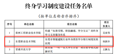 本次申报由省级教育行政部门组织、审核、推荐,全国高校共申报956项任务。经过教育部初审、复审、公示等环节,共评选出23个终身学习制度建设任务、61个学历继续教育教学改革创新任务、32个自学考试改革创新任务、103个非学历教育改革创新任务和50个三教统筹协同创新任务。我校建筑学院院长杨润丰申报的《东莞市智能建筑行业终身教育学分银行制度实践应用》项目入选终身学习制度建设任务榜单,人工智能学院刘丽萍老师申报的《社区教育中非遗文化的德育价值及其实现路径研究——以东莞茶山镇茶山公仔为例》项目入选非学历教育改革创新任务榜单。
