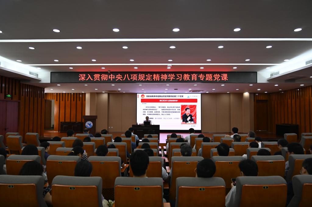 党课最后,贺定修校长号召全体党员干部深入贯彻中央八项规定精神学习教育,一体推进学查改,以优良作风凝心聚力、干事创业,为学校实现更高质量发展提供有力保障。