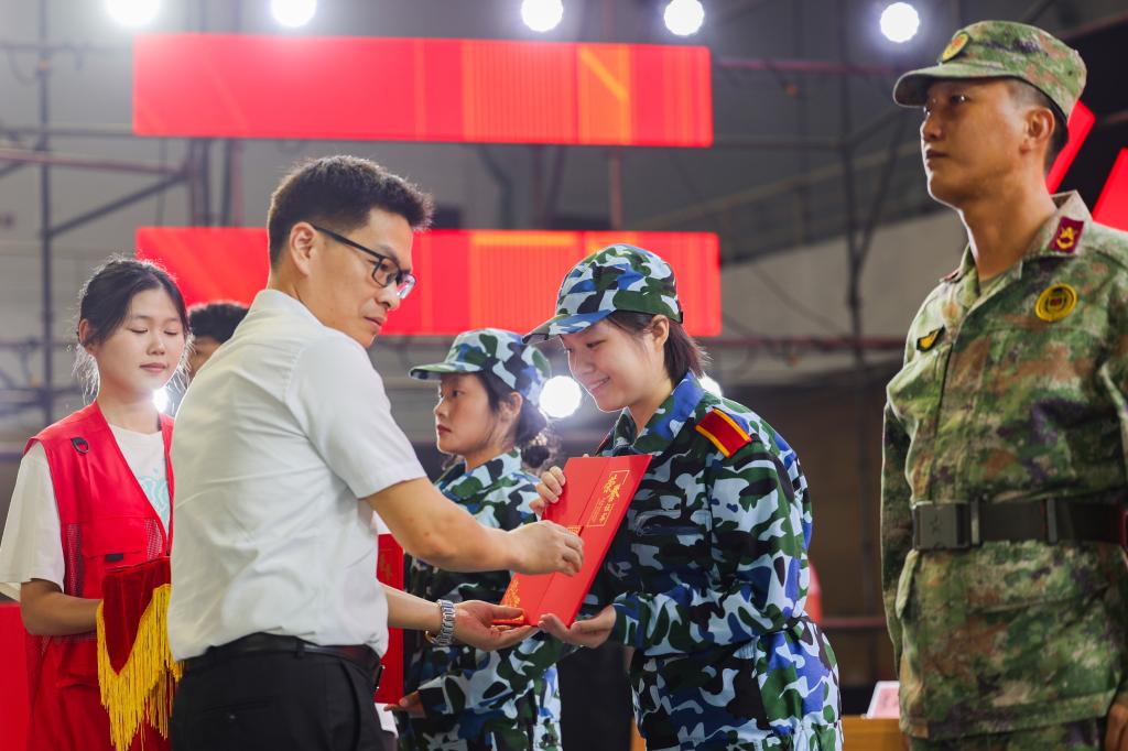 在表彰环节,杨云奇副校长宣读《关于表彰东莞职业技术学院2025级新生军训工作先进集体和先进个人的决定》。蔡东宝副书记为获奖集体和个人代表颁发了荣誉证书。