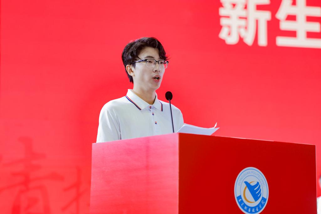 在校生代表人工智能学院钟烨和卫生健康学院新生代表廖振泽先后发言。他们共同提及“崇德、笃行、精技、创新”的校训,并表示将不负韶华、奋勇拼搏,为学校高质量发展贡献青春力量。智能制造学院李笑勉老师,作为教师代表向新生送出寄语:“要以技能成就未来,凭坚持铸就精彩”。