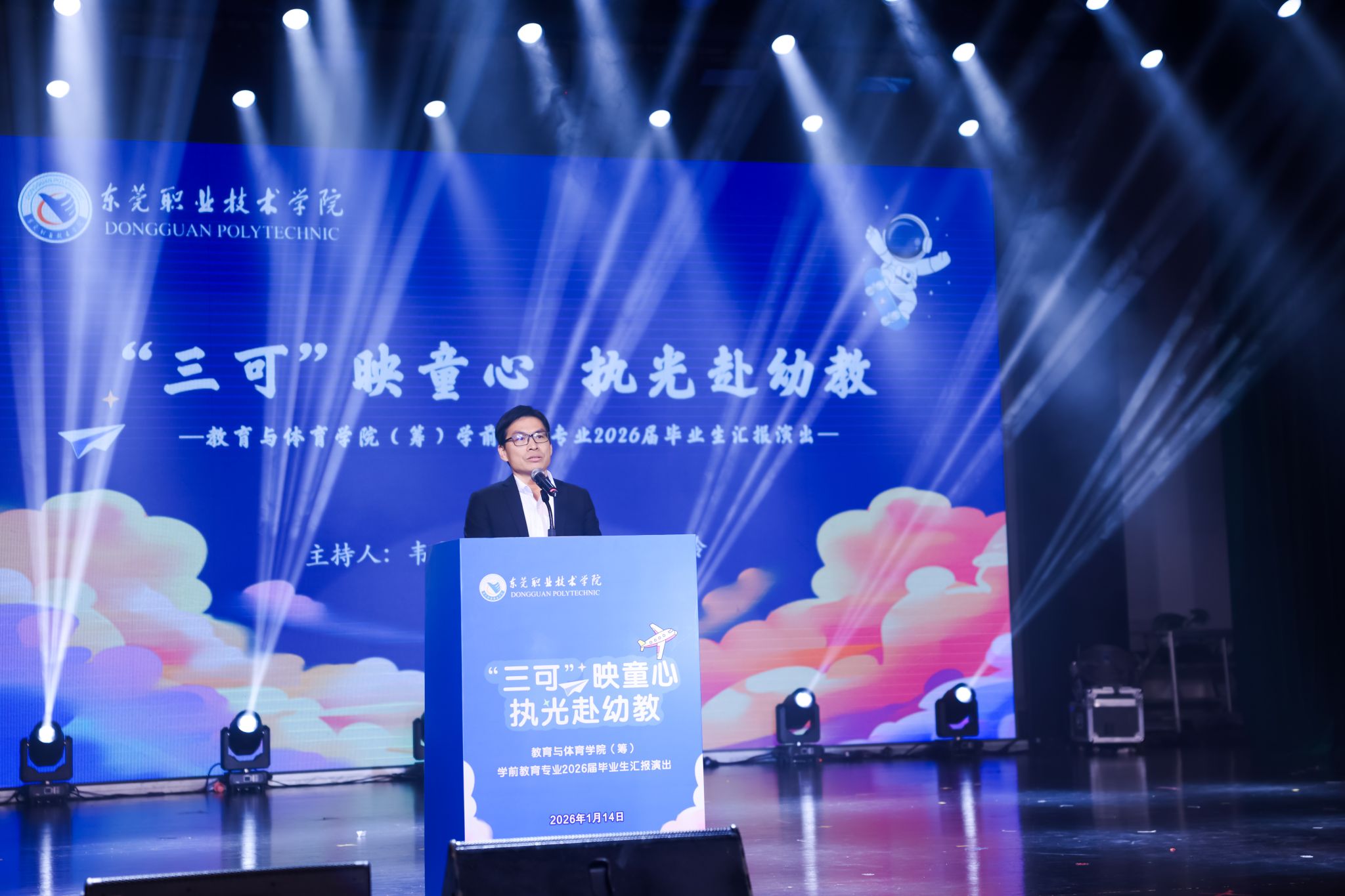 近日,我校教育与体育学院(筹)以“三可映童心,执光赴幼教”为主题的学前教育专业2026届毕业生汇报演出在梦想剧场温情启幕、圆满落幕。学校党委副书记、纪委书记蔡东宝,东莞市学前教育研训与评估中心多位园长代表,学校各部门中层领导莅临现场,与全体师生、家长以及东职院附属幼儿园小嘉宾们齐聚一堂,共同见证学子们三年寒窗磨砺后的成长蜕变与风采绽放。
