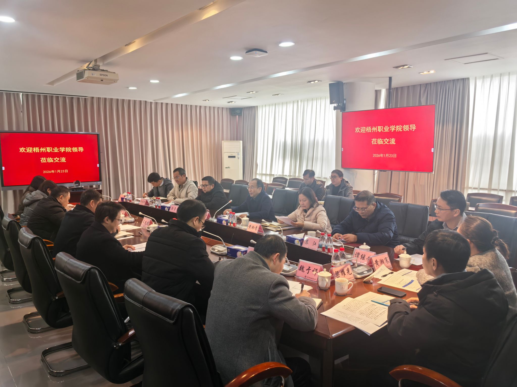 1月23日,梧州职业学院党委副书记、院长王剑彪率队到访我校。我校党委副书记、院长贺定修及相关部门负责人参加了接待交流活动。来访团一行参观了学校清风园廉政教育基地、智能终端检测中心、智慧物流综合实训室、数字化智能制造工厂等教育教学基地。