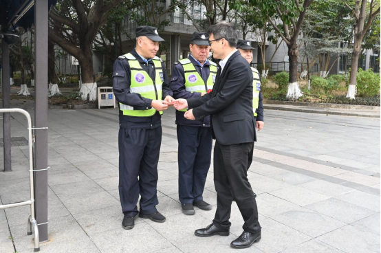 慰问中,蔡东宝指出,在万家团圆的新春佳节,大家以校为家、默默坚守,用责任担当和辛勤付出守护着校园的平安和谐,为全校师生员工欢度新春佳节提供了有力保障。他希望大家继续发扬爱岗敬业的优良传统,以龙马精神迎接新的一年,严格落实值班值守制度,扎实做好各项服务保障工作,共同守护校园安全稳定。