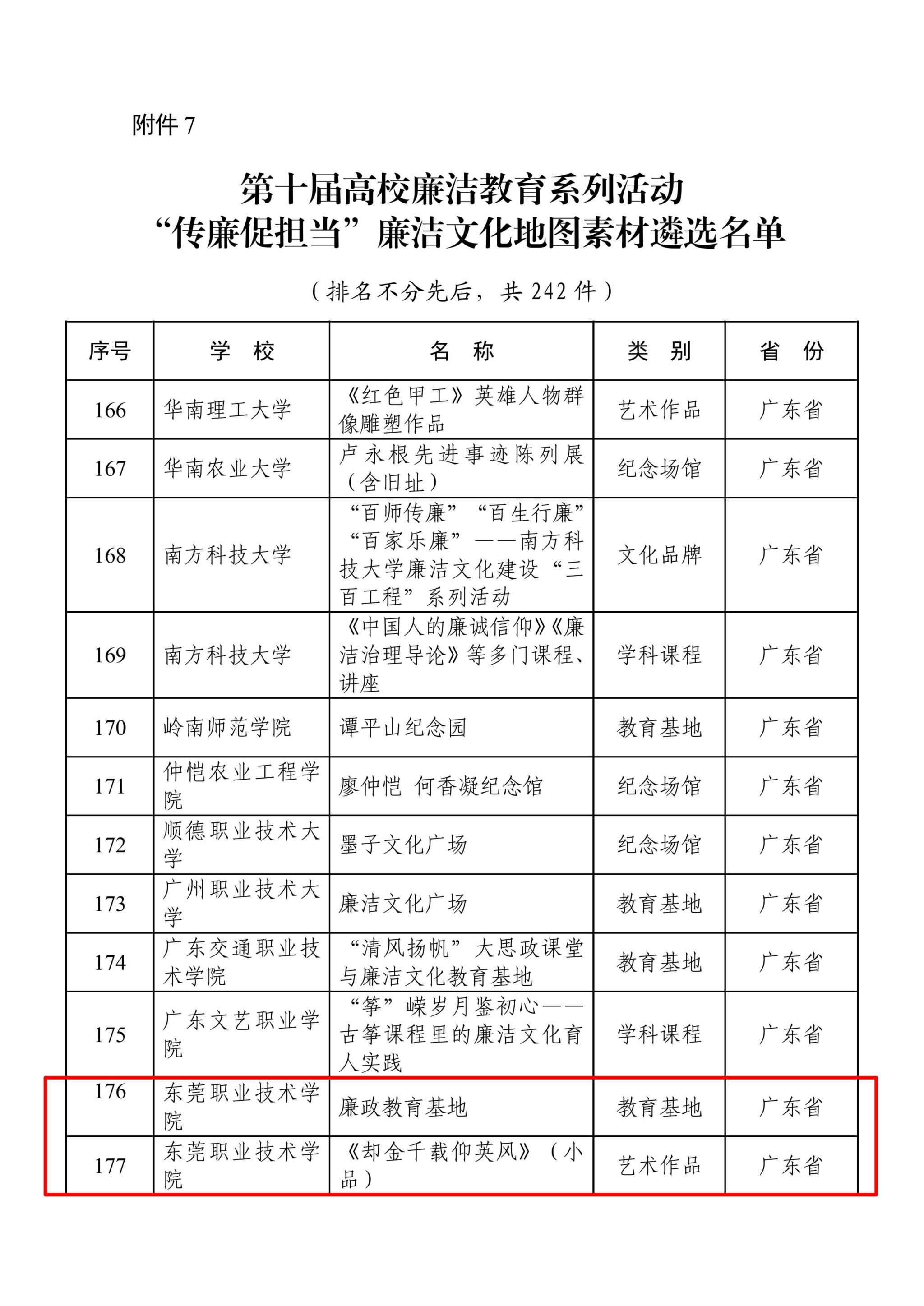 第十届高校廉洁教育系列活动由教育部思想政治工作司主办,面向全国全日制普通高等学校教职工和在校学生开展。我校《致未来的自己——东莞职业技术学院毕业生廉洁文化课》入选廉洁文化课优秀作品(全国100件,广东省7件);《贯通·融合·共生:“大中小思政课一体化”的廉洁教育创新实践》入选廉洁实践课优秀作品(全国100件,广东省12件);廉政教育基地、小品《却金千载仰英风》2件作品入选廉洁文化地图素材(全国242件,广东省13件)。这是我校将廉洁教育融入育人全过程的实践成果,有力推动进一步形成可复制、可推广的廉洁文化教育“东职模式”。