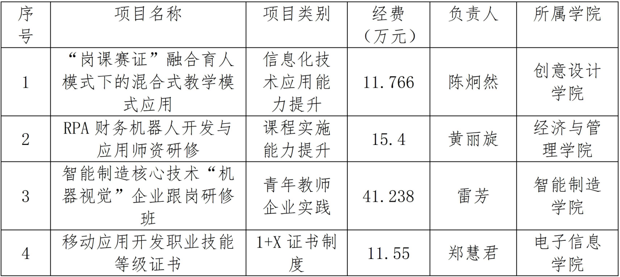 2021年11月,根据《广东省教育厅关于开展2022年职业院校教师素质提高计划竞争性申报工作的通知》的有关要求,继续教育学院组织各二级学院开展申报工作,共收到申报材料7份,经省教育厅组织专家评审,4个项目获批立项,名单如下: