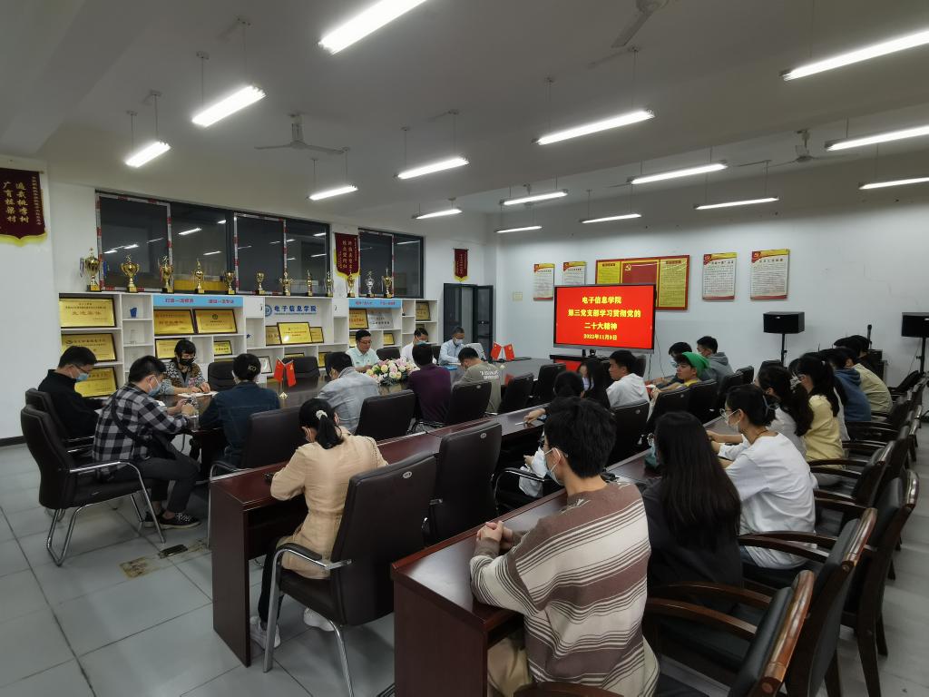 11月9日下午,为深入学习贯彻党的二十大精神,我校电子信息学院各党支部分别举行了主题党日活动,全体师生党员参加了活动。