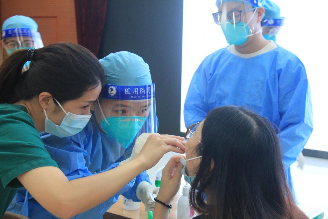 志愿者队伍来到南城医院,双方进行工作交接后,志愿者队伍分为多个小组赴南城社区各采样点协助开展核酸检测。在核酸采样点,卫院学生志愿者在南城医院医护人员的指导下顺利完成当天的核酸采样工作,学生志愿者娴熟的采样技术获得南城医院医护人员的一致好评。