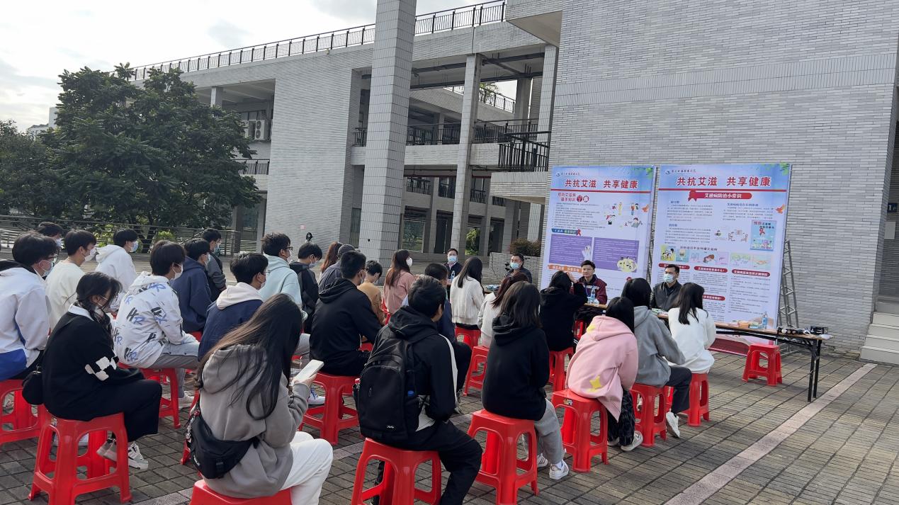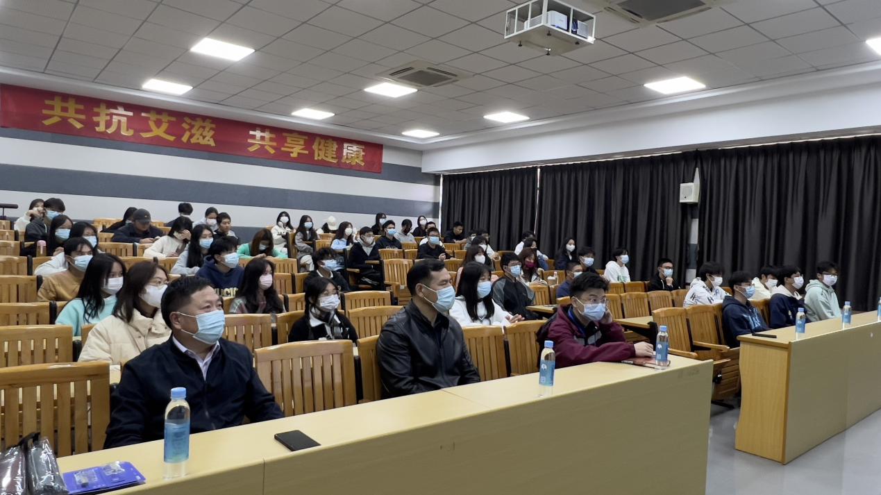 2022年12月1日是第35个“世界艾滋病日”。为了提高青年学生性病、艾滋病防治知识知晓率,12月6日下午,我校在教四102宣传室举办了一场主题为“共抗艾滋,共享健康”的讲座,主讲专家为松山湖疾控中心钟鹏。参加此次讲座的有后勤处副处长曹益军、学生处副处长李俊衡、医务室雷俊、欧春丽、以及学生代表60余人。