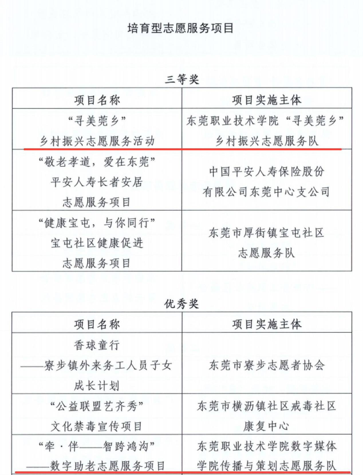 近日,共青团东莞市委员会、东莞市精神文明建设委员会办公室、东莞市民政局等17个单位联合下发《关于2023年“益苗计划”——东莞志愿服务组织成长扶持行动暨志愿服务项目大赛获奖名单的通报》,我校共有5个志愿服务项目获奖,其中智能制造学院“汽车医生”汽车安全知识普及与急救技能培训项目获初创型二等奖;启创科教志愿服务协会“小小科学+”社区科教公益苗圃和建筑学院“寻美莞乡”乡村振兴志愿服务活动分别获示范型、培育型三等奖;经济与管理学院“守望松湖,你我在行动”水资源保护志愿服务项目和数字媒体学院“牵·伴——智跨鸿沟”数字助老志愿服务项目分别获示范型、培育型优秀奖。我校获评优秀组织奖。
