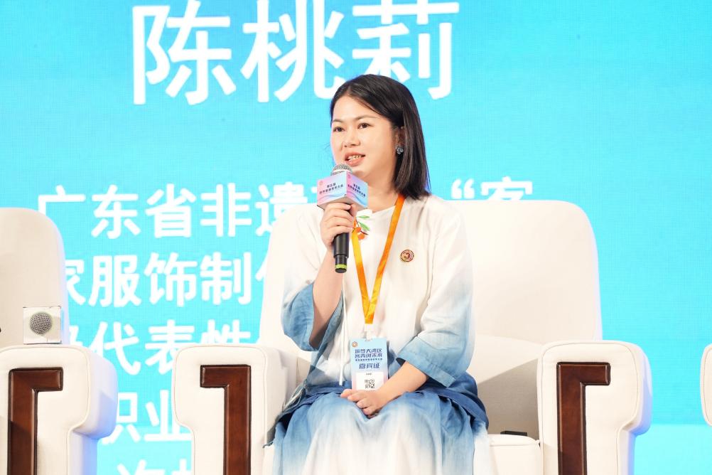 陈老师就客家服饰文化的深厚内涵、客家文化在高校及社会的传承与创新路径、传统文化跨界互联等议题,与来自海内外的青年领袖进行了深入交流和探讨。陈老师表示客家文化应与现代科技、艺术、设计等领域深度融合,创造出新的文化产品和体验形式,从而吸引更多年轻人的关注和参与。