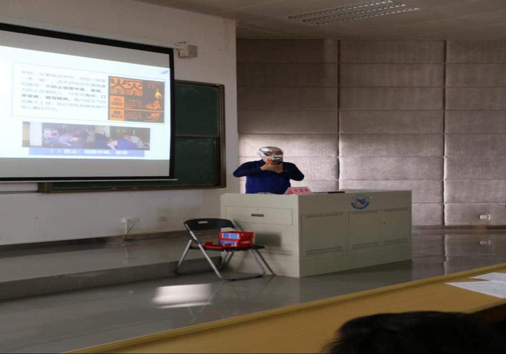 消防安全知识培训的课上,方宏杰教官根据学校消防重点部位工作人员岗位特点,结合近期典型火灾事故案例,通过火灾现场图片、视频对校园各重点部位的火灾危害、火险识别、隐患排查等方面进行了详细讲解,指导培训人员如何加强火灾防范,如何提升自救互救技能,以及灭火器、灭火毯、防毒面具的使用方法。