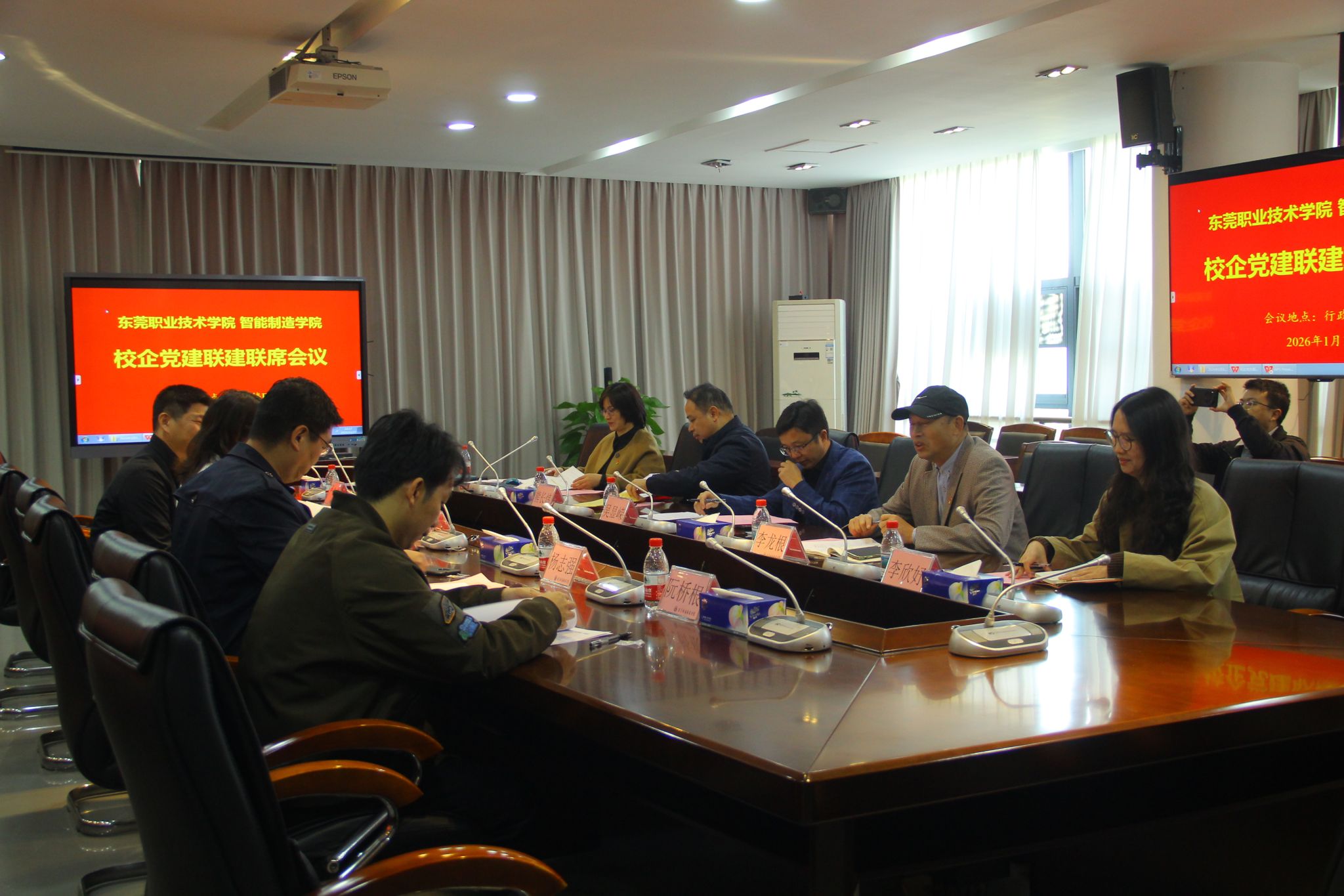 1月13日上午,我校在立德楼B415召开东莞职业技术学院智能制造学院校企党建联建会议。我校党委组织部部长吴显嵘、智能制造学院党总支书记李龙根、东莞市机电工程学校党总支书记张俊容、东莞市电子商贸学校党总支书记李茂才、东莞新能德科技有限公司党支部书记杨志强、广东日信高精密科技有限公司代表卢王来等出席会议。中高企三方共商党建联建发展新模式,共谋产教融合提质增效新路径。