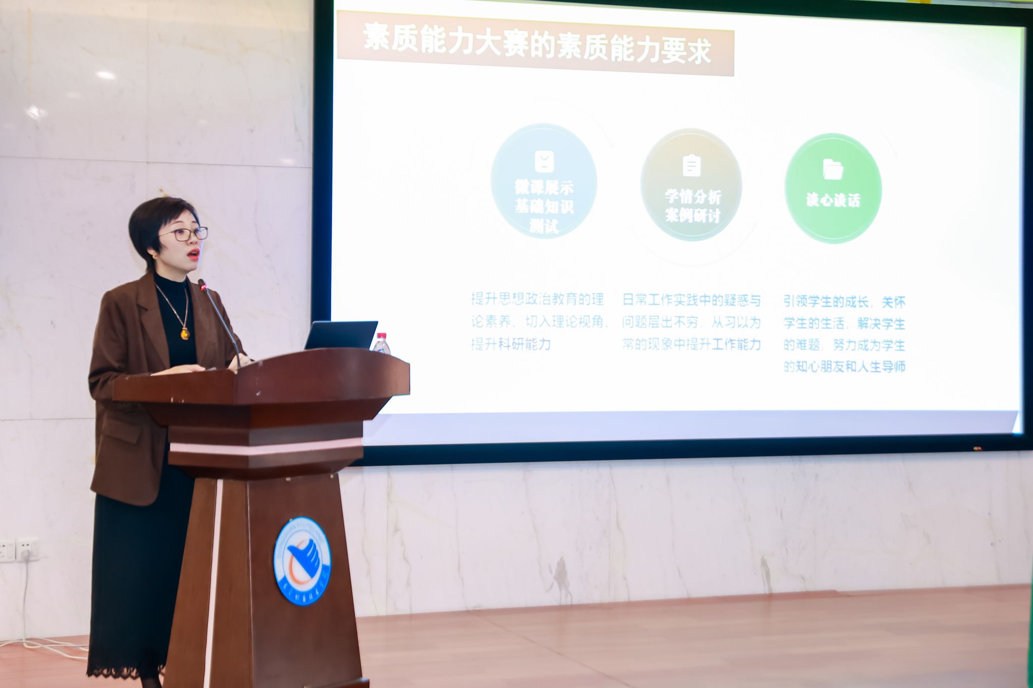 讲座中,陈教授以“基于大赛视角的高校辅导员素质能力提升”为主要内容,结合多届国赛、省赛题型与典型案例,系统解读了基础知识测试、学情分析、案例研讨、谈心谈话四大核心环节的考察重点与备赛策略,从政策文件解读、多源数据分析、问题根源剖析到沟通技巧运用,全方位传授了“以赛促学、以赛促建、以赛促干”的实战方法,引导辅导员将赛事备赛与日常育人工作深度融合,实现从“经验育人”到“科学育人”的能力跃迁。讲座现场气氛热烈,参训人员认真听讲、积极互动。