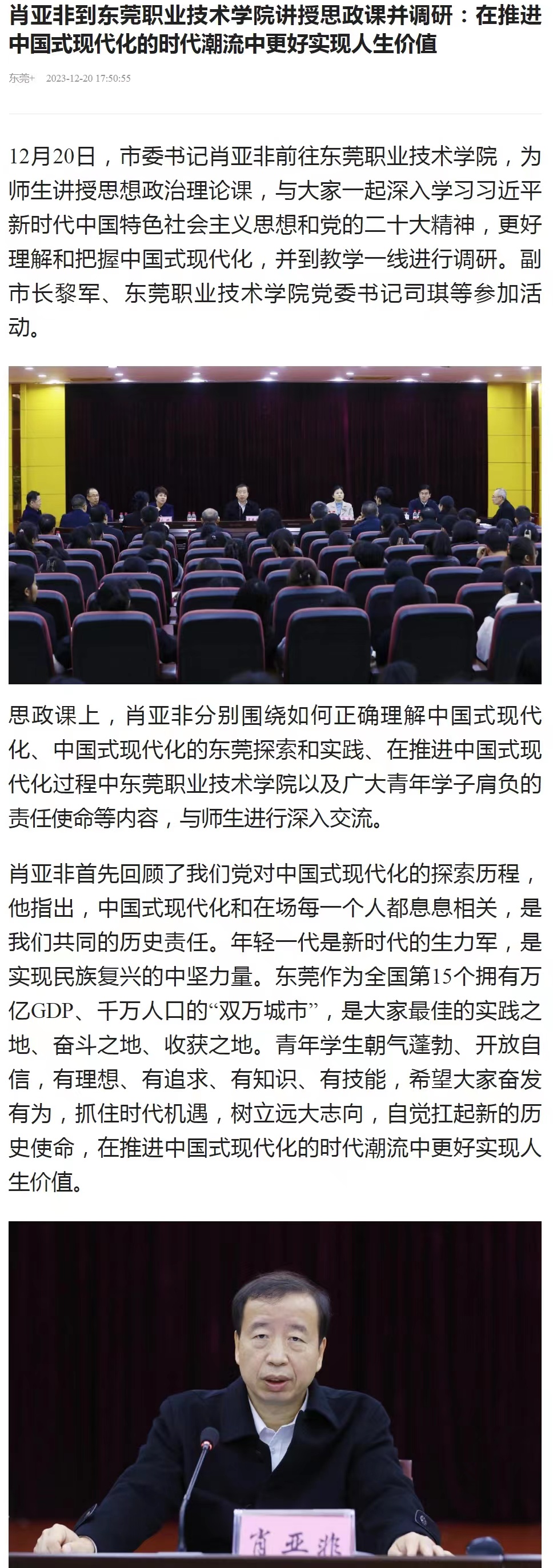 【东莞+】肖亚非到东莞职业技术学院讲授思政课并调研:在推进中国式现代化的时代潮流中更好实现人生价值