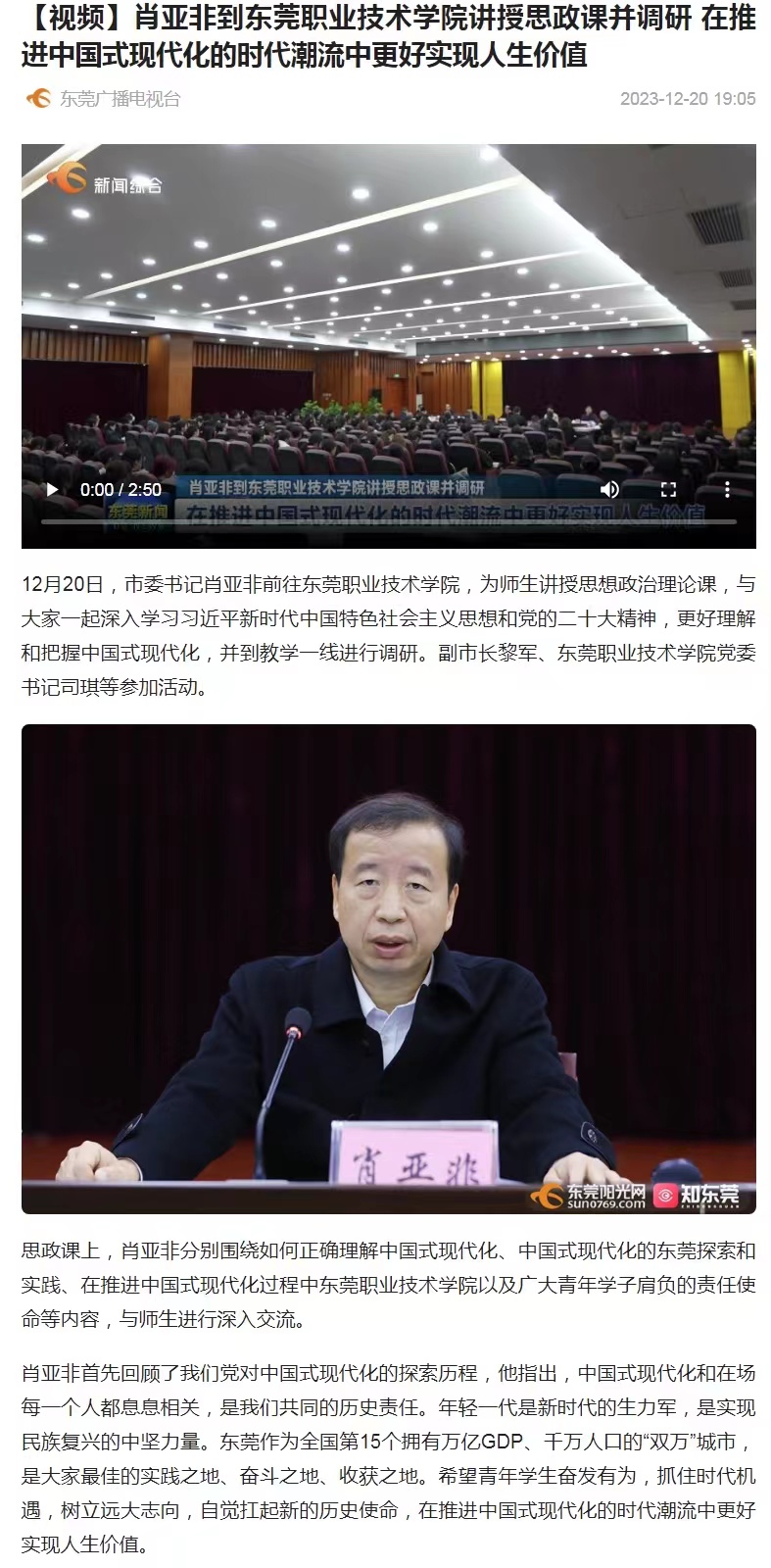 【东莞广播电视台】肖亚非到东莞职业技术学院讲授思政课并调研 在推进中国式现代化的时代潮流中更好实现人生价值