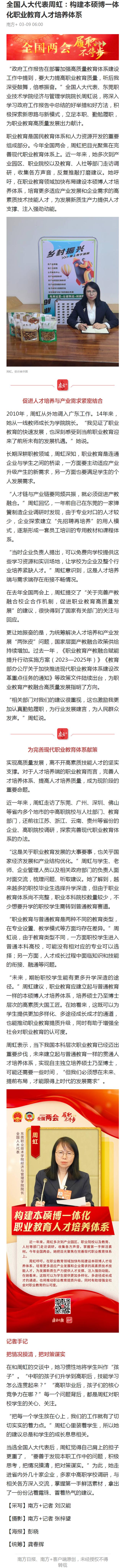 【南方+】全国人大代表周虹:构建本硕博一体化职业教育人才培养体系