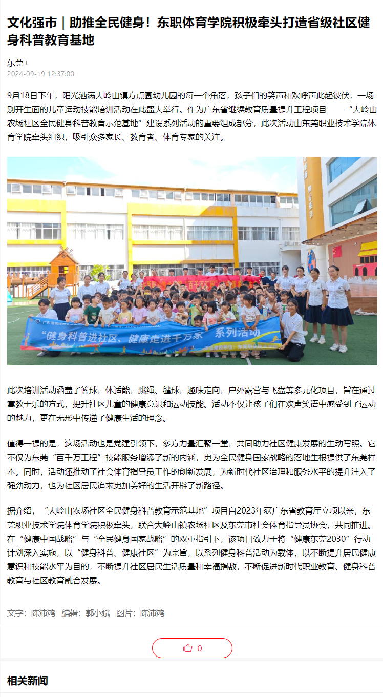 【东莞+】文化强市|助推全民健身!东职体育学院积极牵头打造省级社区健身科普教育基地
