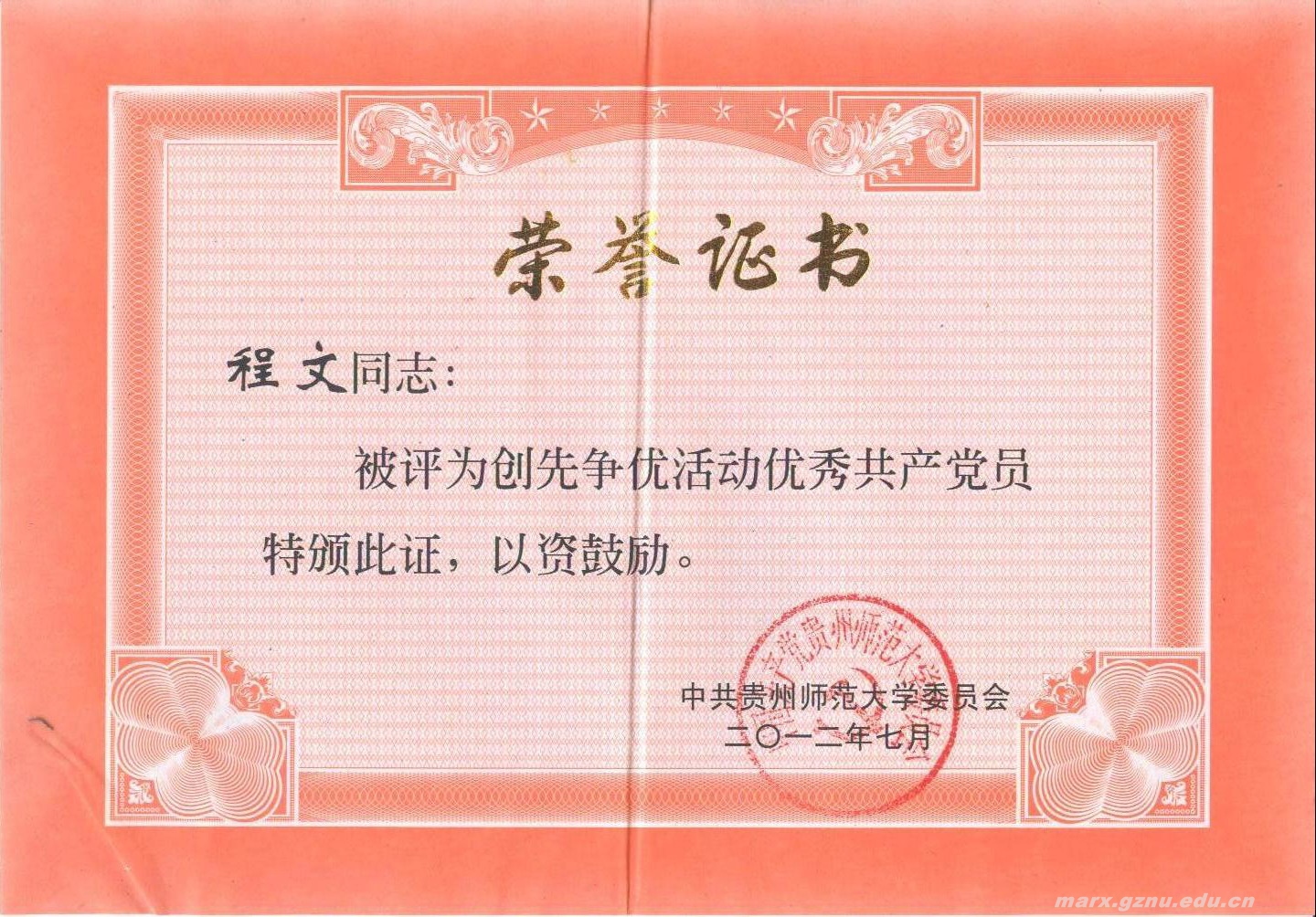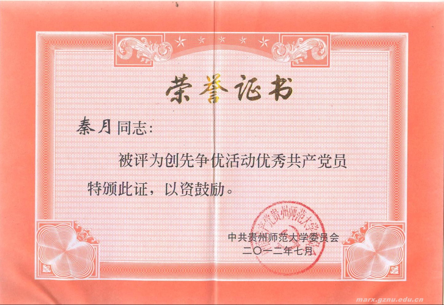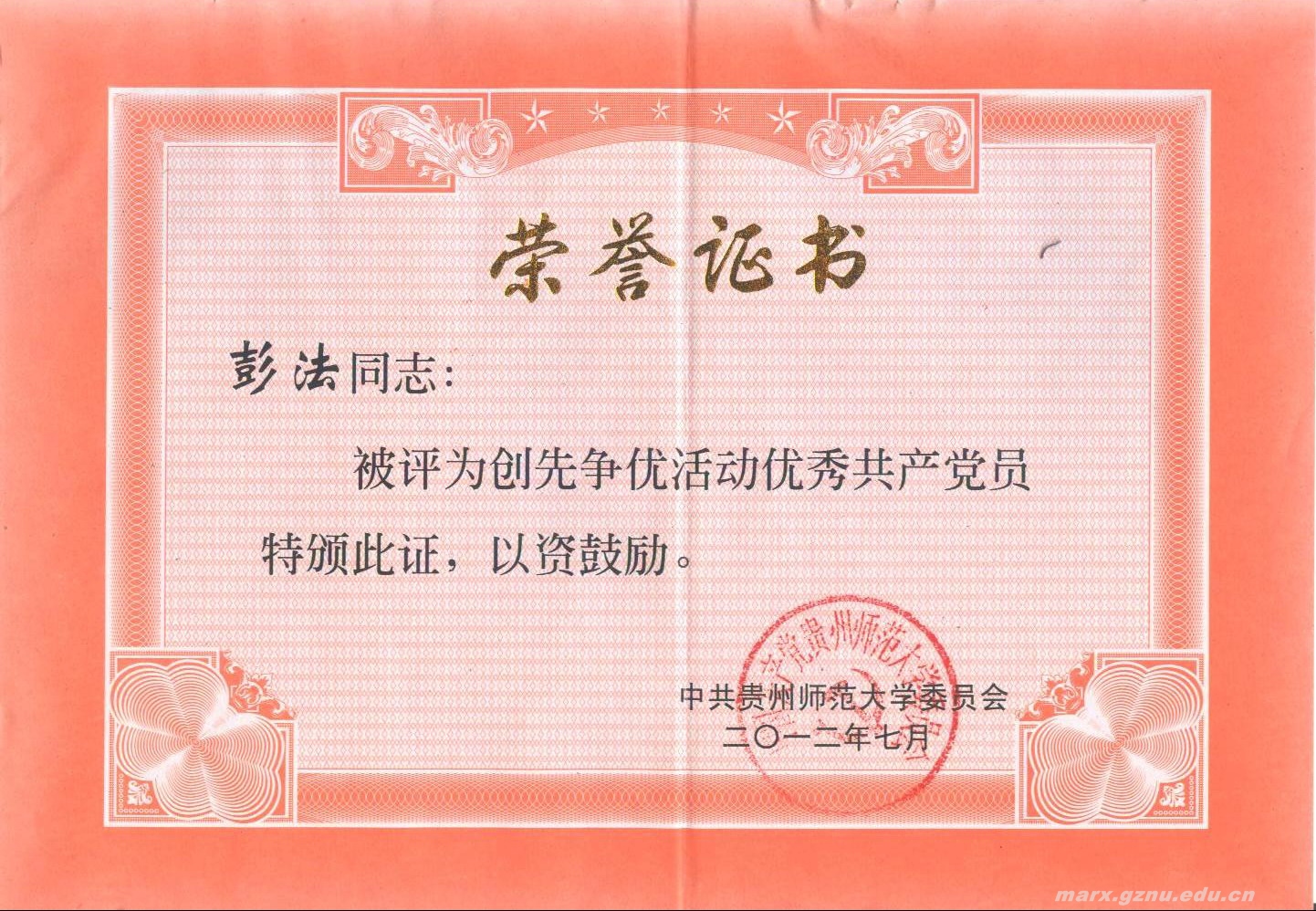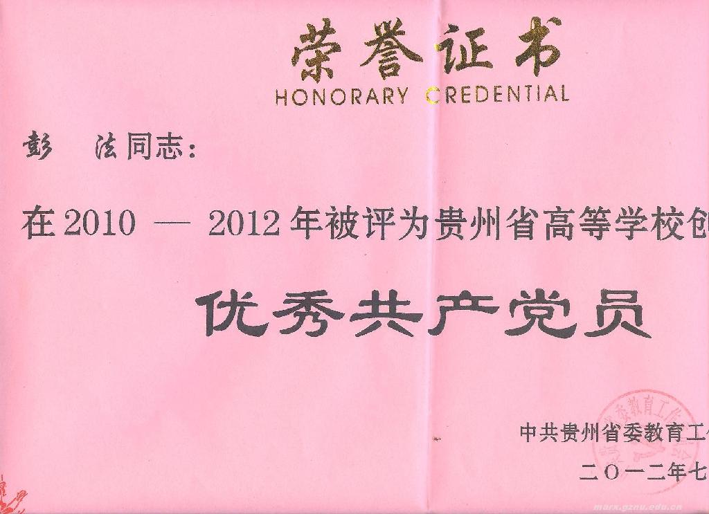 其中,《毛泽东思想和中国特色社会主义理论体系概论》学科党支部被评为贵州师范大学先进基层党组织。彭法同志被评为贵州省高等学校创先争优优秀共产党员,肖纯荣、彭法、卢勇、程文、秦月等五位同志被评为贵州师范大学创先争优活动优秀共产党员。李安峰同志的论文《高校基层党组织如何在创先争优中强化服务理念》被评为贵州师范大学创先争优活动优秀理论成果二等奖(一等奖空缺)。