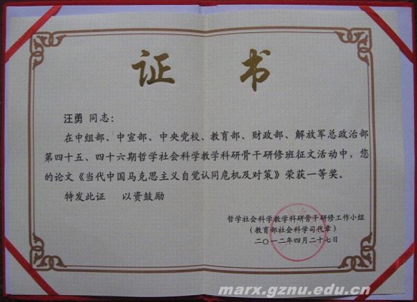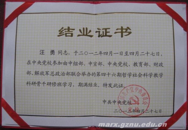 根据研修要求,汪勇积极撰写论文参加征文比赛,在第45、46期共216名学员提交的81篇参赛论文中,经领导小组及班委坚持公平、公正、公开的评审原则,一共评出获奖论文9篇(其中一等奖2篇,二等奖7篇)。在结业典礼上,中宣部副部长、教育部社科司司长等部门领导参加并公布了贵州师范大学汪勇撰写的《当代中国马克思主义自觉认同危机及对策》荣获一等奖等评选结果并发给荣誉证书,为学校、学院和自己争得了荣誉和光彩。