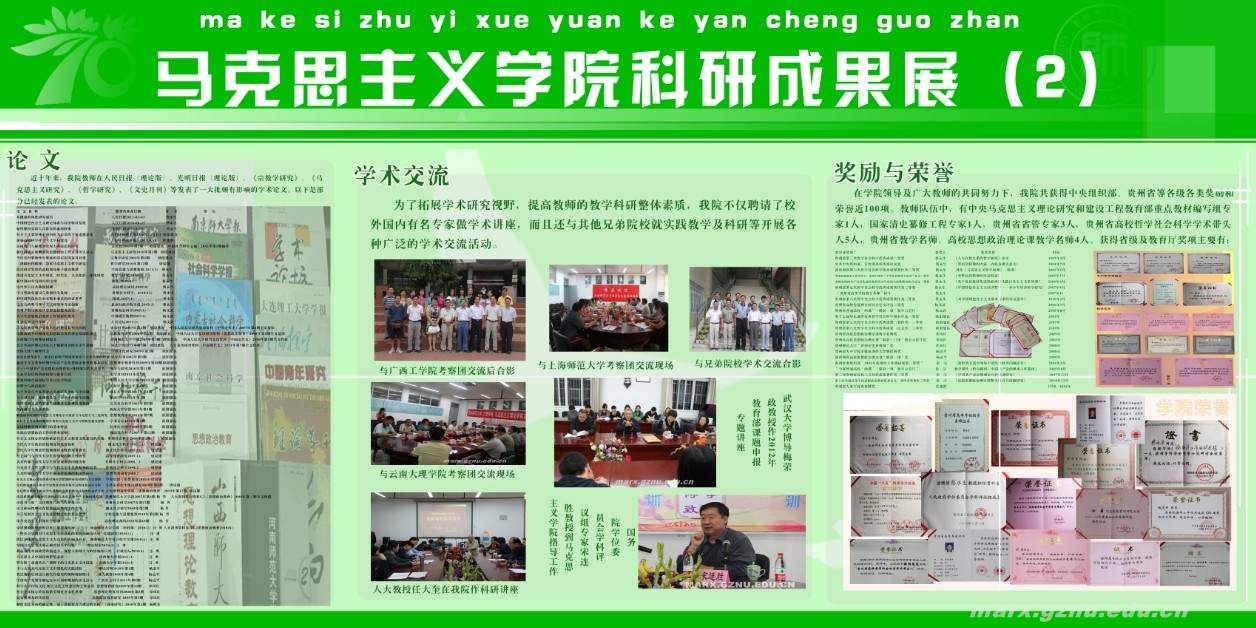 11月18日,由社会科学处主办的我校70周年庆典活动科研成果展评奖结果揭晓:历史与政治学院、化学与材料科学学院等2个学院荣获一等奖,文学院、教育科学学院、太阳成集团tyc151cc、数学与计算机科学学院、地理与环境科学学院、机械与电气工程学院等6个学院荣获二等奖,法学院、经济与管理学院、外国语学院、物理与电子科学学院、生命科学学院、音乐学院、体育学院、材料与建筑学院、国际旅游文化学院、职业技术学院、大学外语教学部、喀斯特生态文明研究中心等12个院、部、中心荣获三等奖,美术学院荣获最佳设计奖,求是学院荣获特别鼓励奖。谢晓尧副校长、蔡永生副校长、社科处谢廷秋处长、科技处李明秀副处长担任此次科研成果展评奖评委。