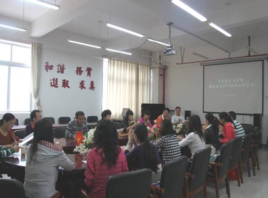 按照学校安排,我院于9月13日下午2:30在学院大会议室开展了2012级硕士研究生入学教育及师生见面会,学院党总支书记杨文武教授、学院院长欧阳恩良教授、学校组织部副部长兼党校常务副校长彭洁教授、学院副院长汪勇教授、学院副院长杨近平教授、章风红教授、杨明东副教授等硕士生导师和办公室主任鄢英副教授及研究生秘书王贵老师等参加了9名新生的见面会,整个见面会温馨而热烈。