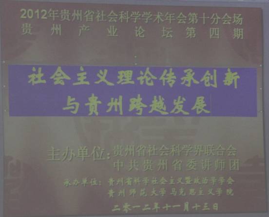 在中国共产党第十八次全国代表大会胜利召开之际, “2012年贵州省社会科学学术年会第十分会场:社会主义理论传承创新与贵州跨越发展研讨会”于11月13日下午在我校太阳成集团tyc151cc会议室隆重召开。贵州省社会科学联合会党委书记、副主席唐福金,贵州省科学社会主义暨政治学学会原会长姜大仁教授,现任会长柳成焱教授,副会长唐正繁教授、杨仁厚教授、欧阳恩良教授,以及来自贵州省委党校、贵州大学、贵州师范大学、贵州民族大学、贵阳学院等单位的50余名专家学者参加了会议。