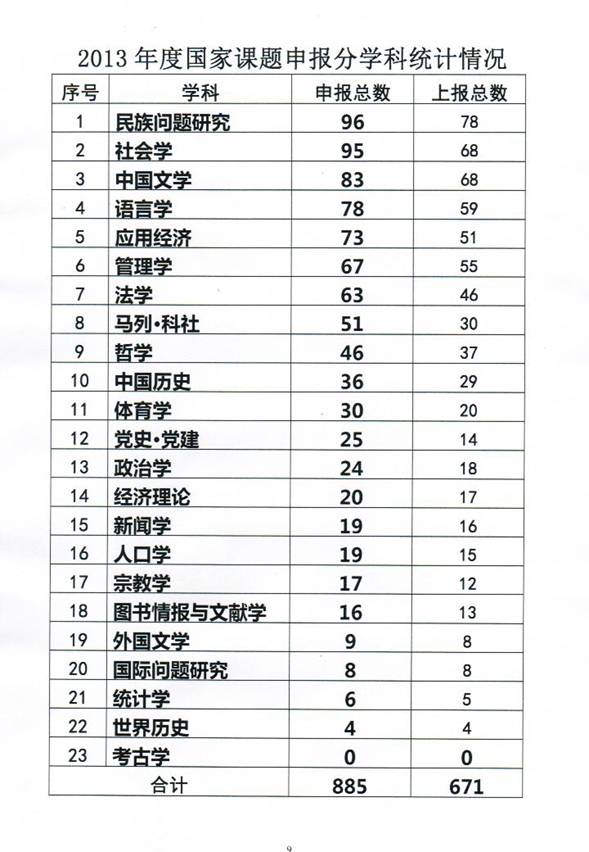 申报学科涵盖了除考古学以外的22个一级学科,传统优势学科继续保持较高的申报数量,申报数居前5位的学科依次是:民族问题研究96项,社会学95项,中国文学83项,语言学78项,应用经济73项。同时,较弱学科申报形势也非常喜人,如世界历史4项,统计学6项,国际问题研究8项,外国文学9项。申报学科涵盖面的扩大和弱势学科申报数量的增长,反映出我省同类选题和学科扎堆申报现象得到有效缓解,学科分布更加均衡。