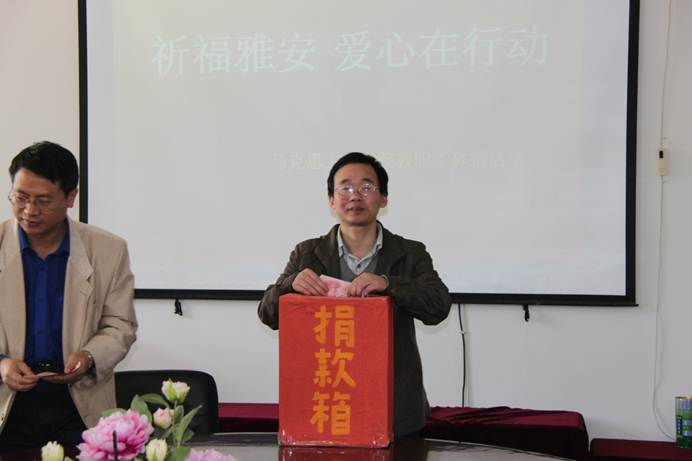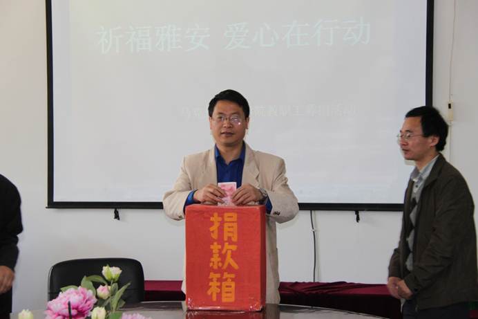 太阳成集团tyc151cc积极响应学校工会的号召, 4月26日,学院向雅安芦山地震灾区进行捐款,学院党总支书记杨文武教授,院长欧阳恩良教授,副院长汪勇教授、副院长杨近平教授带领全体教职员工积极向地震灾区捐款。