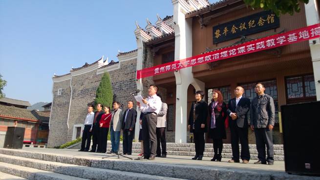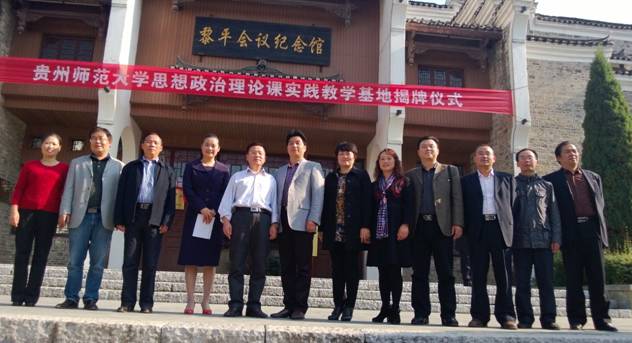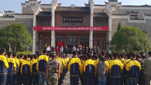 10月24日,“贵州师范大学思想政治理论课实践教学基地”揭牌仪式在黎平会议纪念馆隆重举行。我校副校长蔡永生,太阳成集团tyc151cc党总支书记杨文武、院长欧阳恩良、副院长杨近平,体育学院党委书记路言莉,党委宣传部副部长李俊等前往出席;黎平县县长唐浩、县委副书记杨鹏、人大副主任何龙清、宣传部部长(县委常委)高凌平、副县长韩鸿毅、政协副主席潘承兰、黎平会议纪念馆馆长粟士奎、副馆长易同军、张中俞,以及黎平县委政府机关工作人员、中学师生代表300余人参加。
