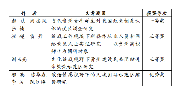 根据通报,我校统战部选送的研究成果中有4项获全省统一战线理论政策优秀成果表彰。其中,我院彭法、谢玉亮、鄢英3位教师在全省统一战线理论政策优秀成果表彰中获奖。
