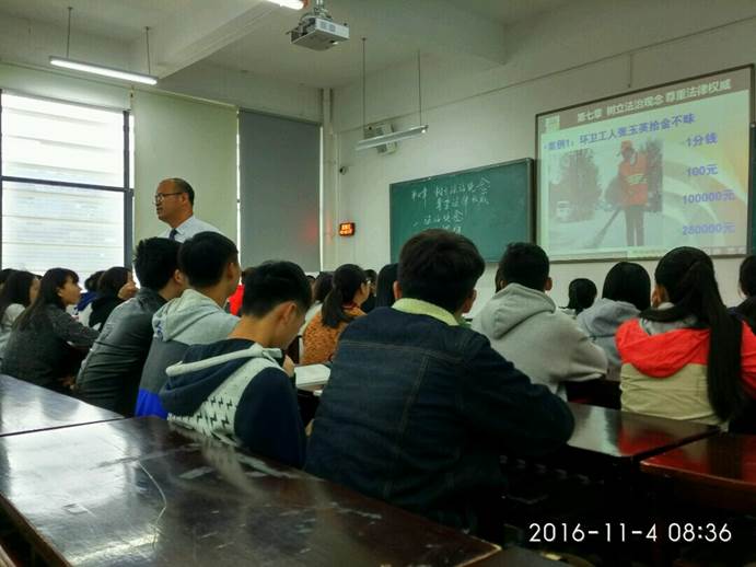 11月4日,“思想道德修养与法律基础”学科组在花溪校区GJ3313教室成功举行了院级公开课。本次公开课由杨席宇博士主讲,授课内容为“树立法治观念,尊重法律权威”。 学校督导组老师郑志平、胡泽尧、章凤红,以及学院部分老师观摩了公开课。