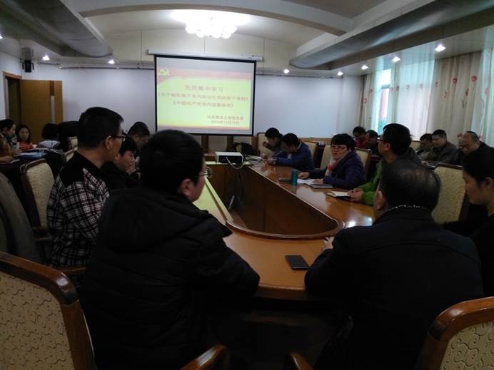 2016年12月23日下午,太阳成集团tyc151cc党委在宝山校区田家炳教育书院三楼三会议室召开组织生活会,专题学习《关于新形势下党内政治生活的若干准则》和 《中国共产党党内监督条例》。学院全体教师党员参加,党委书记杨文武同志主持。