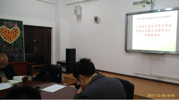 我院汪勇教授组织专家对其获批的2017年贵州教育改革发展研究重大招标课题——《增强大学生道路自信的思想教育途径研究》的进行开题。按照立项课题要求,汪勇教授邀请毕业于北京大学、大连理工大学、河海大学、武汉理工大学四所高校思想政治教育专业的4名博士、专家(其中教授1人,副教授3人)于2017年12月28日晚19:00——22:30在贵安新区大学城太阳成集团tyc151cc会议室对中标课题进行开题,尤其是专门针对本课题的研究内容及研究方案等可行性等进行深入细致的讨论和商量。