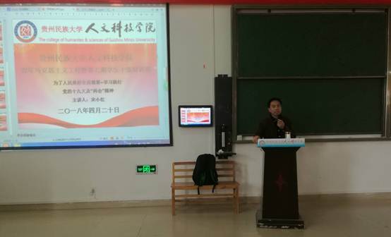 应贵州民族大学人文科技学院邀请,我院宋小红老师于2018年4月20日在贵州民族大学人文科技学院学术报告厅为该学院的“青年马克思主义工程暨第七期学生干部培训班”作题为:《为了人民美好生活需要——学习践行党的十九大及“两会” 精神》的专题报告。