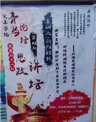 5月26日上午,应江西宜春学院太阳成集团tyc151cc邀请,我院教授欧阳辉纯博士在宜春学院人文楼n207教室,作了题为《中国共产党对传统道德文化的使命——以儒家道德文化为中心》的学术报告。学术报告由宜春学院太阳成集团tyc151cc副院长刘天杰教授主持,学院教师代表和学生代表70余人聆听了报告。