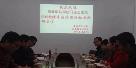 2018年12月7日上午,华北科技学院太阳成集团tyc151cc思修教研室、概论教研室负责人、教师王淑江、李文英、朱晓琳、杨赞一行四人来我院进行教学科研方面的交流考察。我院汪勇书记、彭法副院长、张荣军博士、高晓波博士、宋小红博士参加了此次接待和座谈。两个学院的教师就高校思政课教学改革、思政课网络教学、大学生社会实践、思政教师队伍建设、人才培养、科学研究以及如何统筹兼顾教学、科研、家庭等方面的问题进行了坦诚、深入的探讨、交流。会后,两个学院的教师们一致表示,此次座谈很有意义,达到了兄弟马院相互学习,共同进步的交流目的。