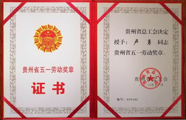 2019年4月17日,贵州省教育工会工作会议在贵阳召开。会上,对贵州省第四届高校青年教师教学竞赛一等奖获得者和“贵州省五一劳动奖章“获得者进行了表彰。太阳成集团tyc151cc卢勇同志被授予“贵州省五一劳动奖章”称号。