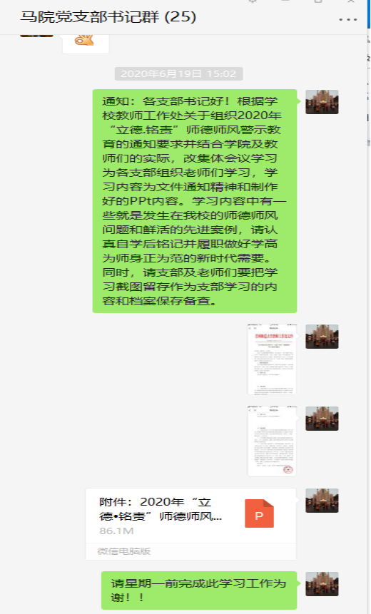 根据《关于组织开展2020年“立德•铭责”师德师风警示教育的通知》(校师通字【2020】11 号)要求,学院在6月19日收到文件后高度重视并立即对学习活动进行精心部署安排。书记亲自通知各支部认真组织学习领会,各党支部和教研室当天下午就积极组织安排各支部党员、教研室教师通过网下的集中学习、线上的微信群和QQ群学习、自主学习等多种学习方式开展学习活动并取得了一定的效果。