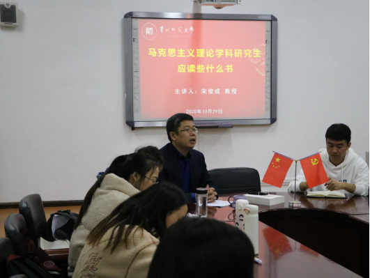 宋俊成教授以“马克思主义理论学科研究生应读些什么书”为主题,主要围绕“马克思主义理论学科属性”和“看什么书”两方面内容进行讲解。第一,在马克思主义理论学科属性上,宋俊成简要阐明了专业和学科的区别,明确马克思主义理论学科的内涵、外延和功能。第二,在看什么书上,宋俊成要求每位硕士研究生在今后的学习中阅读五类书。第一类为阅读马克思、恩格斯、列宁、毛泽东、邓小平等革命导师传记,其旨在了解马克思主义经典作家的生平与思想,培养马克思主义理论性趣;第二类为阅读马克思主义经典著作和中国化马克思主义经典著作,奠定坚实的马克思主义理论基础;第三类为阅读马克思主义理论学科各专业相关的基本原理、基本方法、学科专业发展史、学科前沿等方面的书籍,其旨在深化对本学科专业知识的学习;第四类为阅读党与国家的重要文件及习近平总书记重要讲话,其旨在了解和领悟党与国家的大政方针;第五类为阅读与马克思主义理论学科密切相关的学科书籍,如政治学、心理学、教育学、哲学等相关书籍,其旨在实现本学科知识与相关学科知识的融合,开拓学术视野。