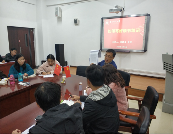 权麟春教授以“如何写好读书笔记”为主题,结合《关于费尔巴哈的提纲》《实践论》《矛盾论》三篇文献进行深入浅出的讲解,并就相关知识点以及做笔记的基本方法与全体同学进行逐一探讨和交流,分享了双方的理解与体会。通过讲解和学习以上三篇文章,权麟春教授强调,在今后的读书和写笔记过程中,首先要对文章予以整体上的把握,其次要注意在阅读过程中,学会精度和泛读的有机结合并牢记文章的中心思想,最后就是要学会拓展查询一些抽象难懂的概念以期达到对文章内容更加广泛而深入的理解。
