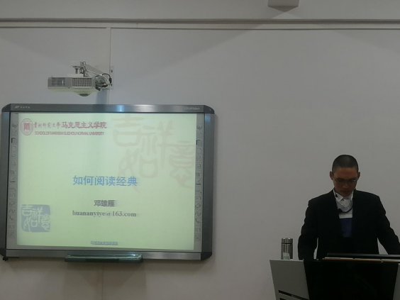 邓雄雁博士以“如何阅读经典”为主题,结合自身求学治学的经历,从经典阅读的重要性、如何通读和泛读、如何做读书笔记、学会分享读书笔记等四个方面展开精彩的讲授。邓博士指出,一要以“诚意”端正读书态度,核心经典就是个人学术发展的“根据地”。邓博士从一幅表现不同读书层次的图画生动地讲出“读书决定人生眼界和格局”“要做智者,不做半吊子读书人”的道理。阅读经典,可以使我们吃透经典核心观点,可以使我们同大师进行深度思想交流,可以使不同时代的大师成为我们的导师;二要以“历险”的精神,正确把握泛读和精读的方法。泛读旨在开疆拓土,拓宽我们的知识面,因此泛读不能仅仅限于自己所学的专业领域,要广泛涉猎,博采众长。根据自身能力和需要,泛读可以灵活采用通读和跳读两种方法。精读可以参考邓小芒老师的“句读”法和五遍阅读法,即第一遍通读,把握整体框架,第二遍通读,逐段理解,第三遍通读,掌握重要理论的论证逻辑,第四遍要读出书中的言外之意,第五遍做好比较阅读;三要以“写作”的要求,学会做读书笔记。好记性不如烂笔头,做阅读笔记能够大大提高读书质量。读书笔记的类型有边框式、摘录式、书评式三种,其中书评式读书笔记是消化吸收经典的重要途径。读书笔记做好后,还要经常回头温习,不断精炼,甚至达到书评水准,同时要学会与人分享。