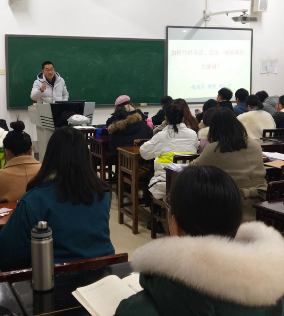 张荣军教授以“如何写好导语、结语、凝练摘要、关键词”为主题,以自己的文章为例结合主题依次进行分析归纳。第一、关于文章标题的构思,要求实、求新、求特,揭示主题、体现中心、吸引眼球;第二、关于如何撰写和提高文章质量,张荣军教授主张通过看经典、读原著、做读书笔记形成区块链的写作方法;第三、对于马克思主义理论数据库,张荣军教授介绍了我校的中国共产党理论数据库资源,并强调其资源是协助写作的一把利器,学会充分利用,实现其价值;第四、对于论文发表和期刊的选择,要学会站在编辑的角度来审视自己的文章,研究生一般适合投地方学院学报;第五、对于摘要的凝练,一般在250字左右,要提高哲学维度,反复推敲摘要。