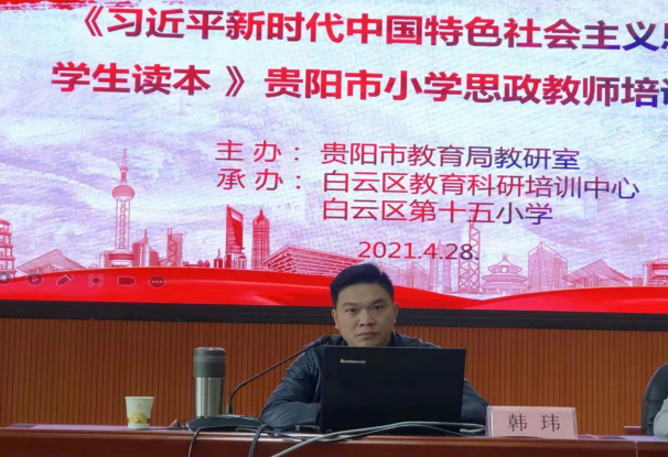 4月28日下午,我院韩玮副教授应贵阳市教科所的邀请为贵阳市小学思政教师作“学习《习近平新时代中国特色社会主义思想》需要掌握的几个基本理论问题”的专题讲座。讲座主会场在贵阳市白云区十五小学报告厅举行。白云区200余名小学思政教师在主会场、贵阳市其他1500余名小学思政教师在分会场以现场转播的方式聆听了讲座。