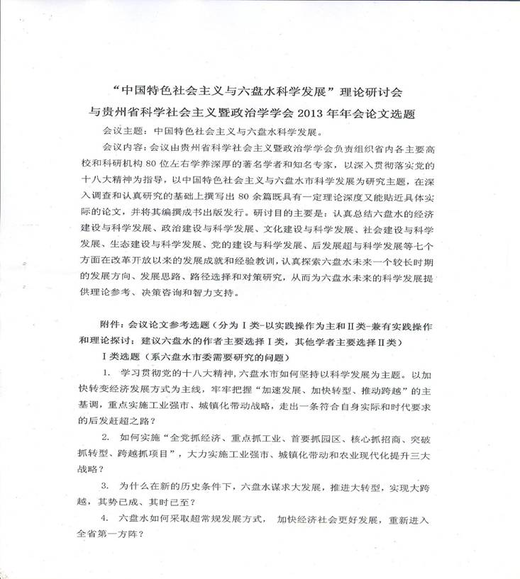 4月27日,贵州省科学社会主义暨政治学学会2013年第一次常务理事会贵州大学马列部会议室召开。按照会议安排,请各会员根据本次理论研讨会中规定的83个II类选题(具体见下文)选择其中的1-2个选题于5月10日前报送刘玲汇总送交审核。选题确定后于8月1日前提交论文初稿,届时参加拟于8月份在六盘水召开的学会年会。(论文所需要资料在可在网上查询)